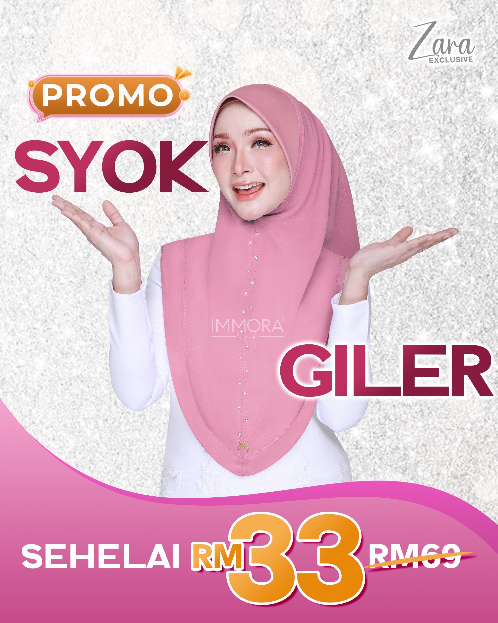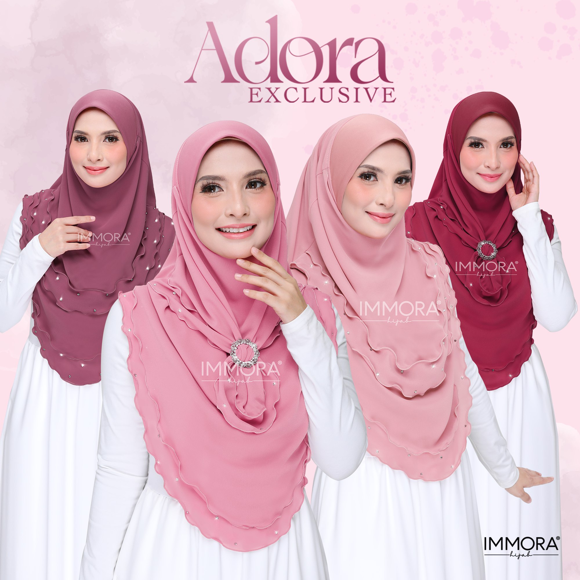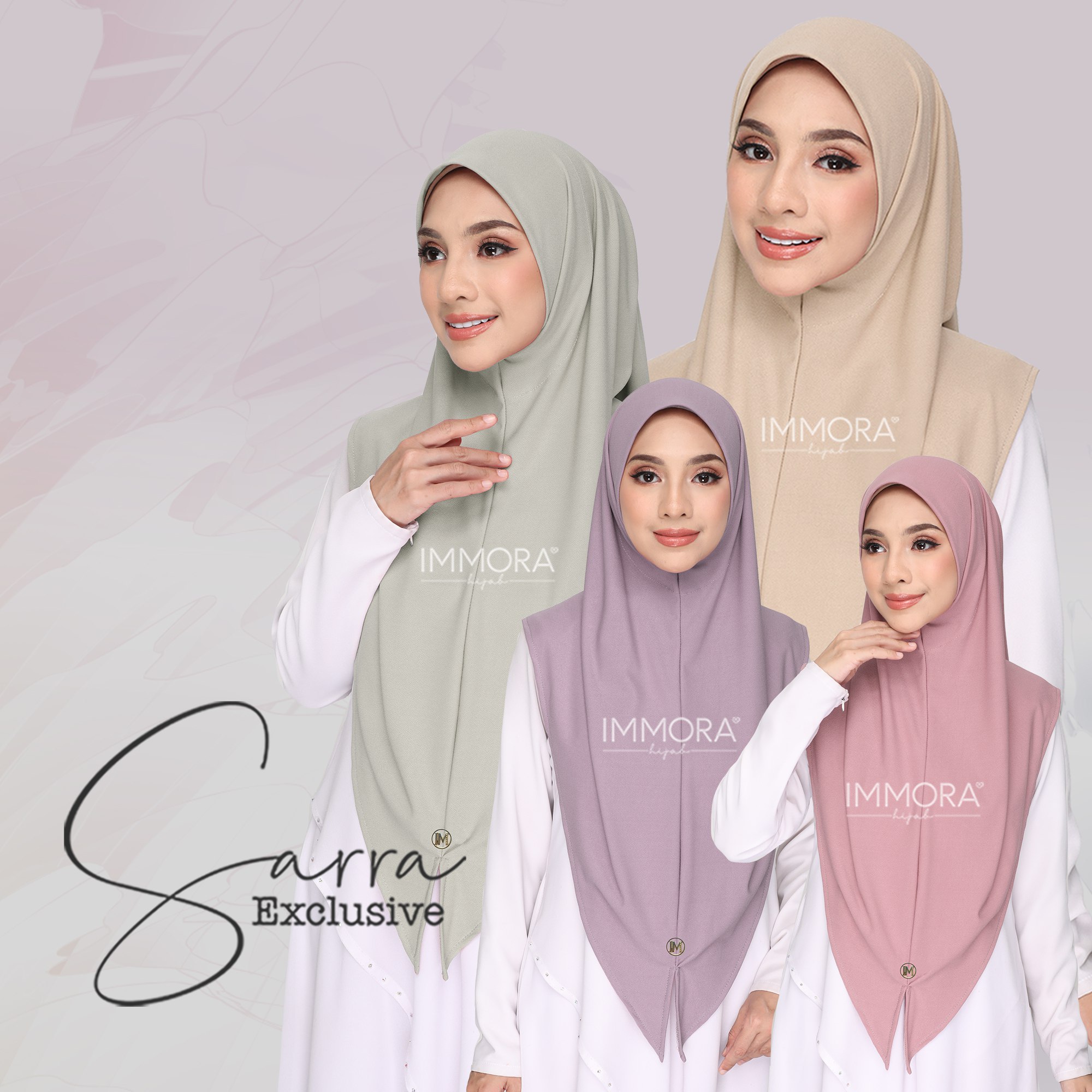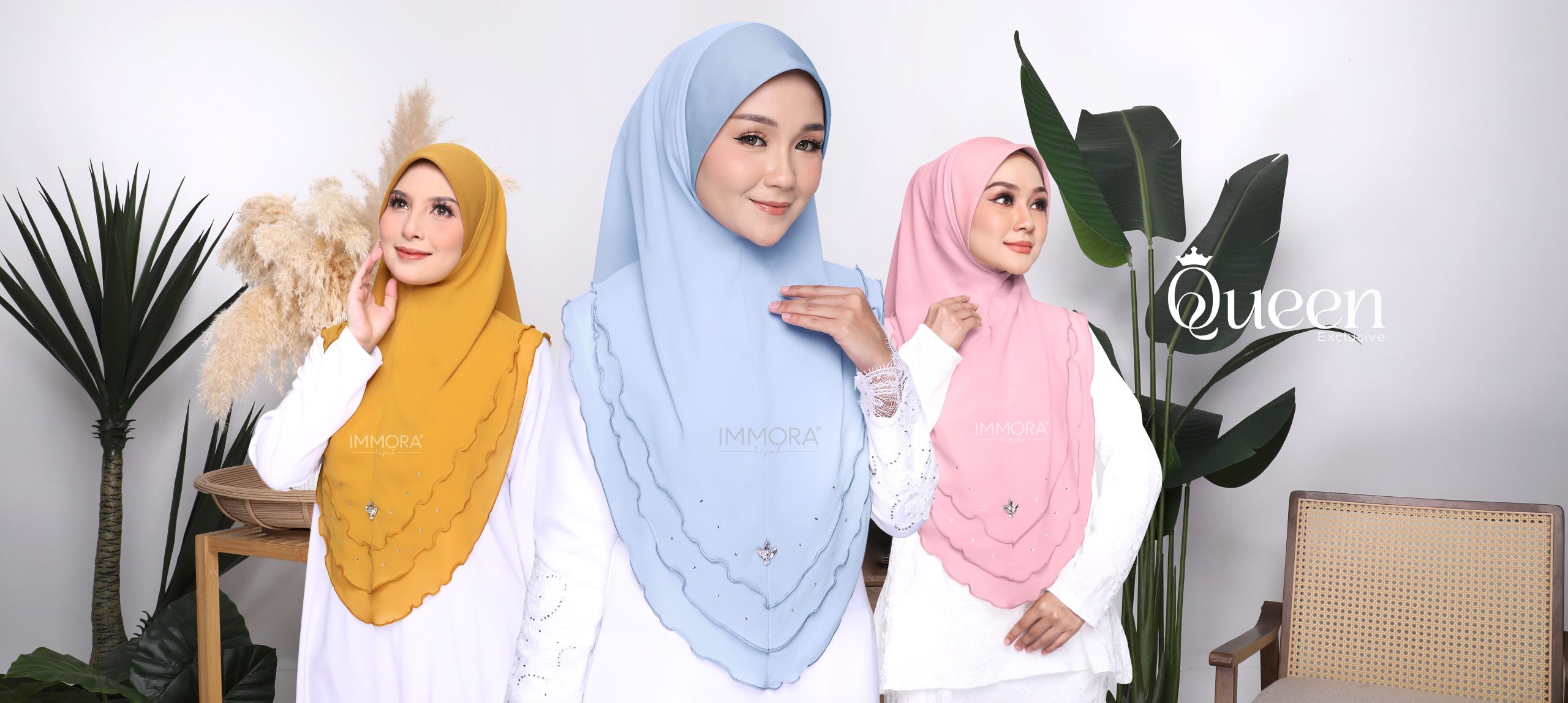 Menggunakan material satin matte textured, Immora Hijab sekali lagi mengeluarkan tudung yang boleh dipakai sepantas kilat. Material ini adalah shining di bahagian luar dan matte di bahagian dalam. Ratu exclusive didatangkan dengan 2 pilihan design iaitu awning shawl dan awning scuba. 1 tudung boleh digayakan dengan pelbgai style ini didatangkan dengan 22 pilihan warna yang menarik.