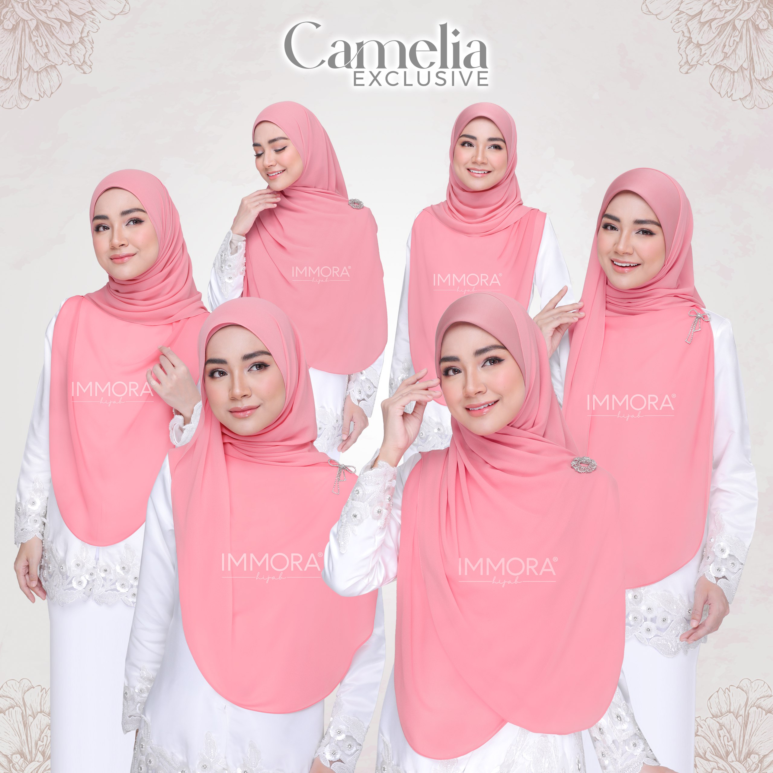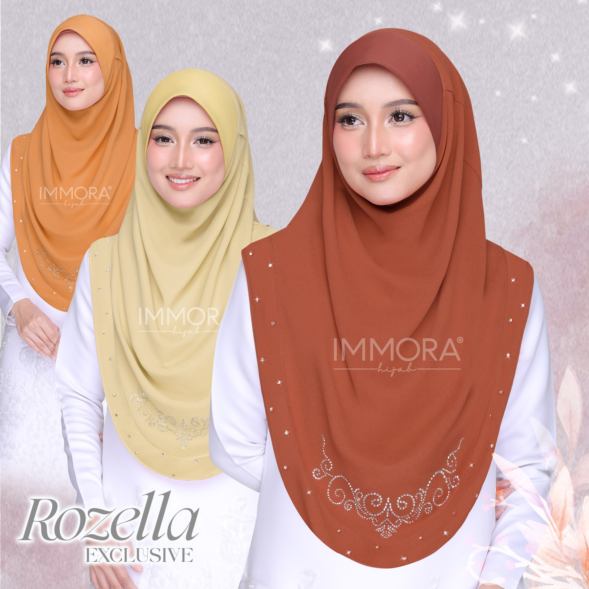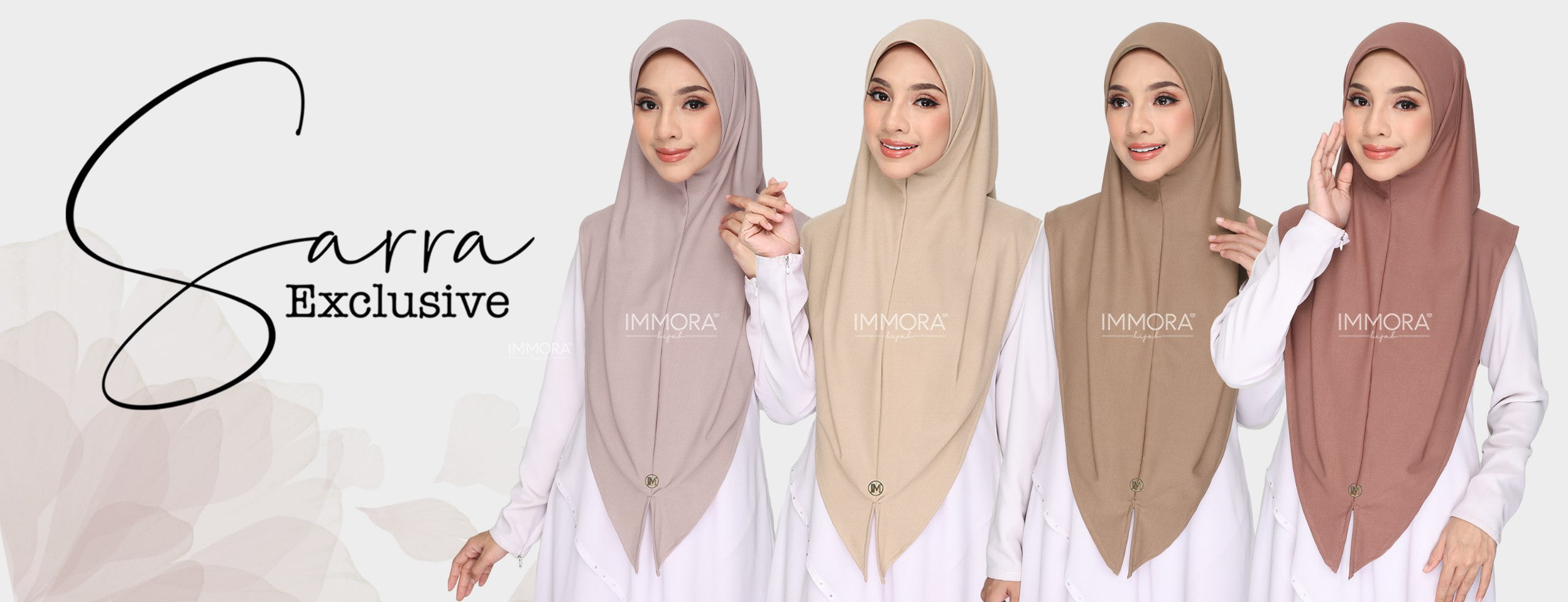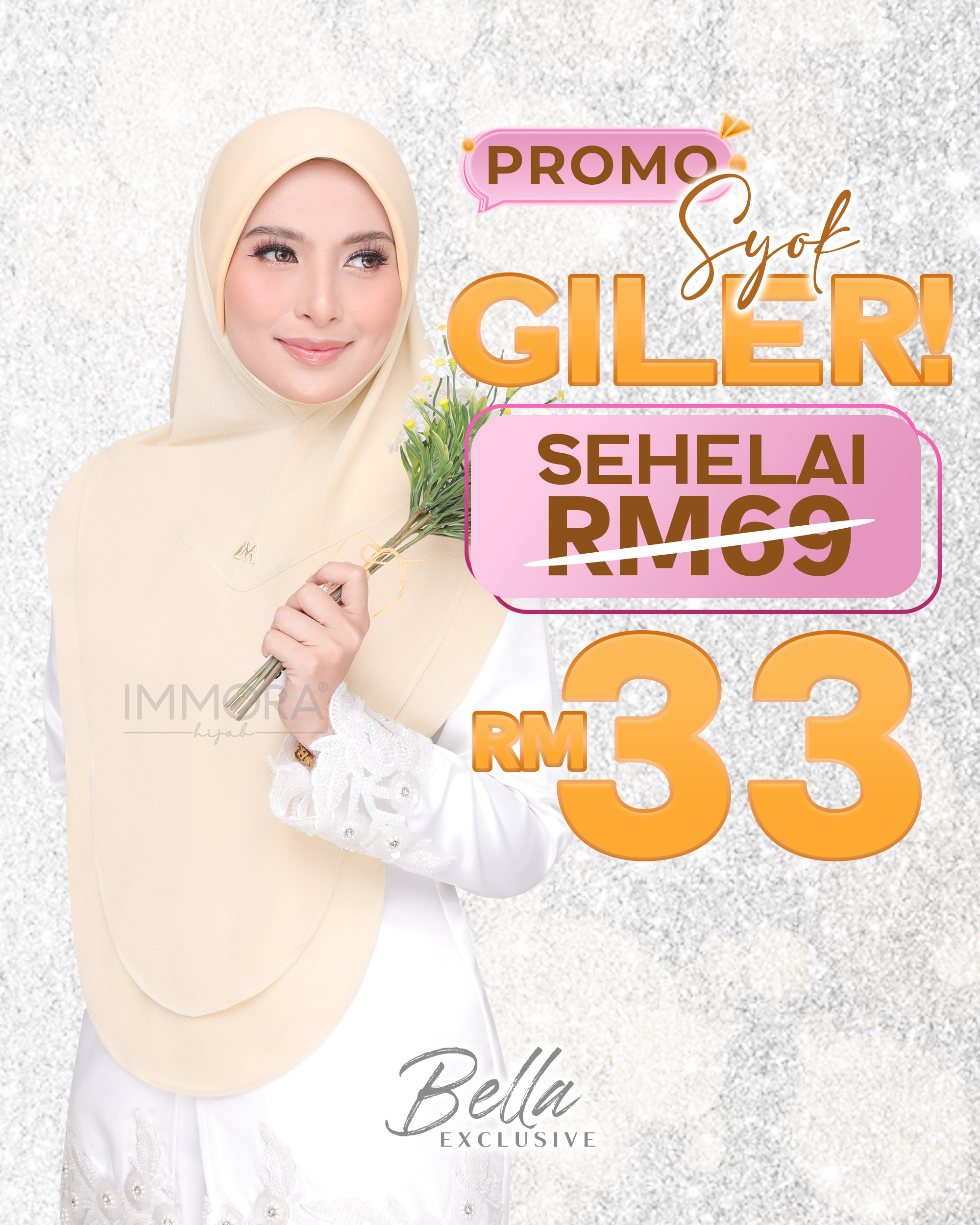 Menggunakan material satin matte textured, Immora Hijab sekali lagi mengeluarkan tudung yang boleh dipakai sepantas kilat. Material ini adalah shining di bahagian luar dan matte di bahagian dalam. Ratu exclusive didatangkan dengan 2 pilihan design iaitu awning shawl dan awning scuba. 1 tudung boleh digayakan dengan pelbgai style ini didatangkan dengan 22 pilihan warna yang menarik.