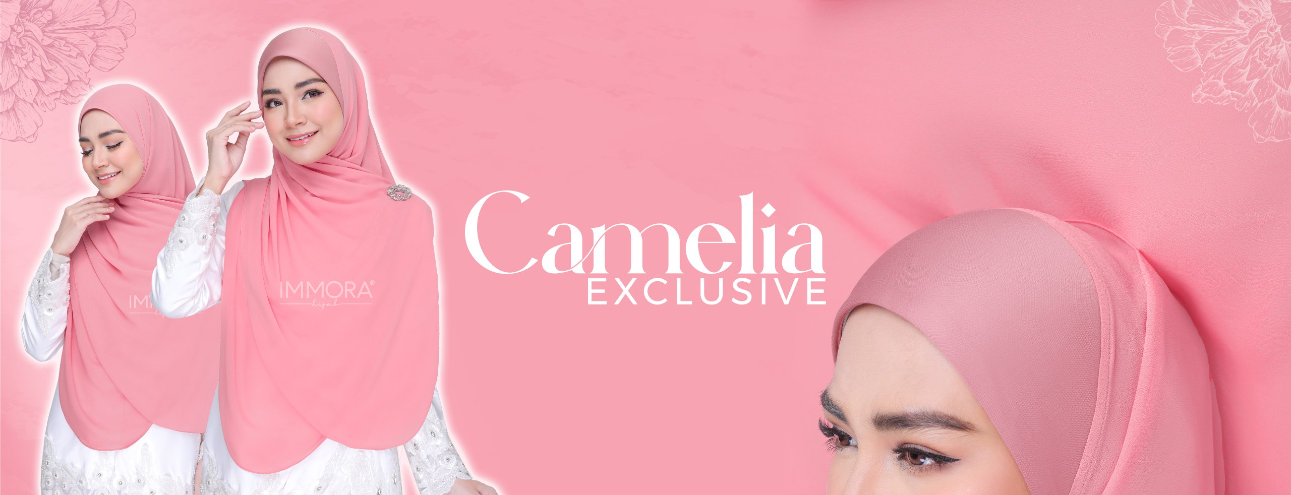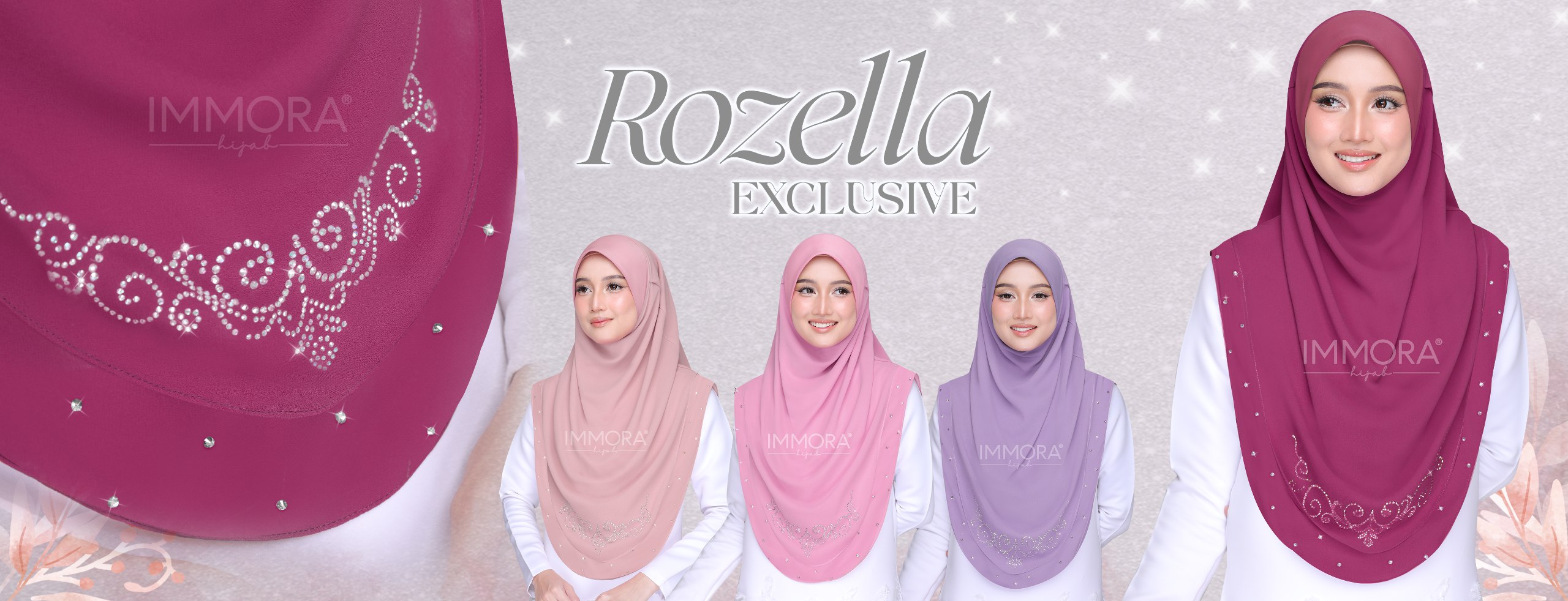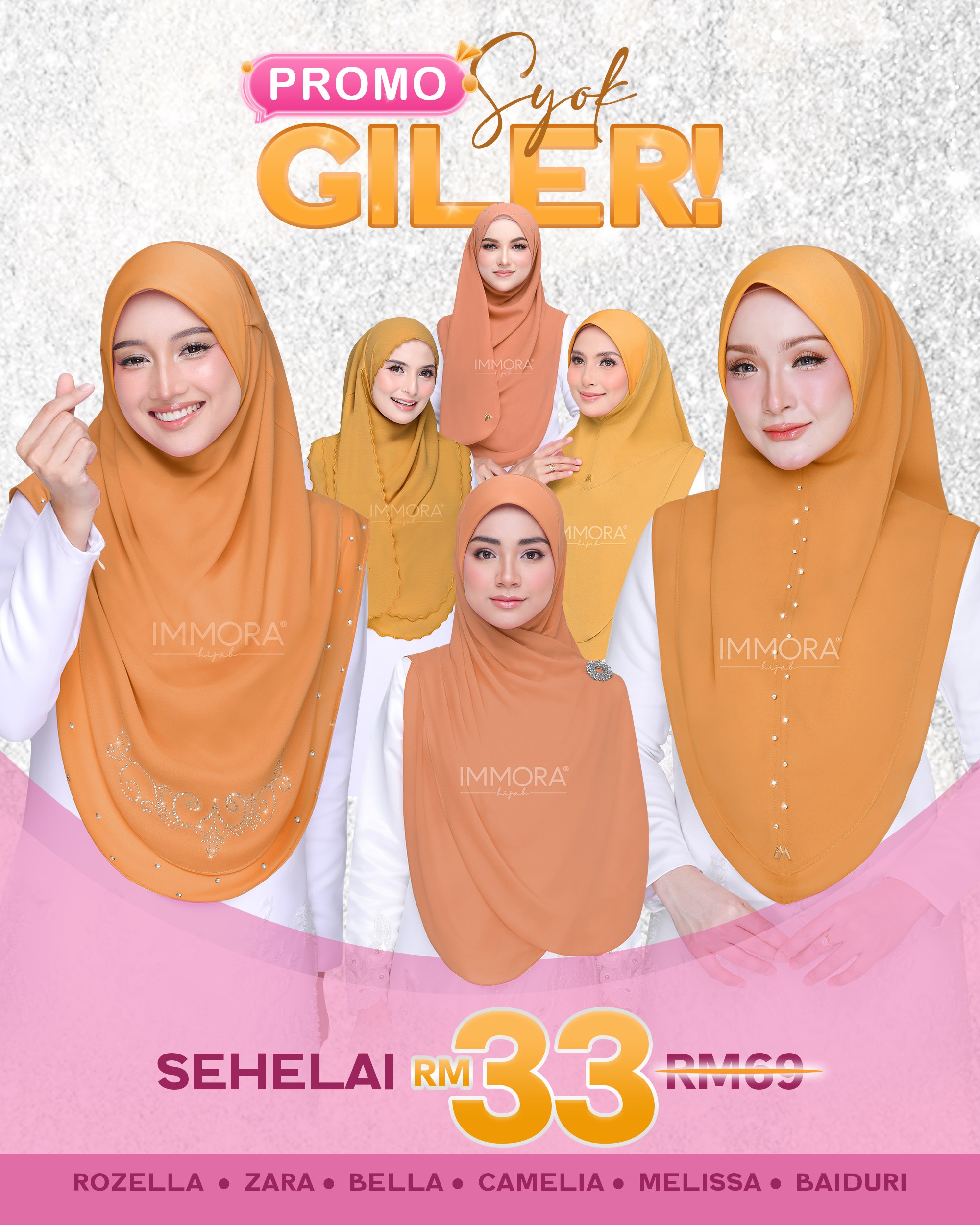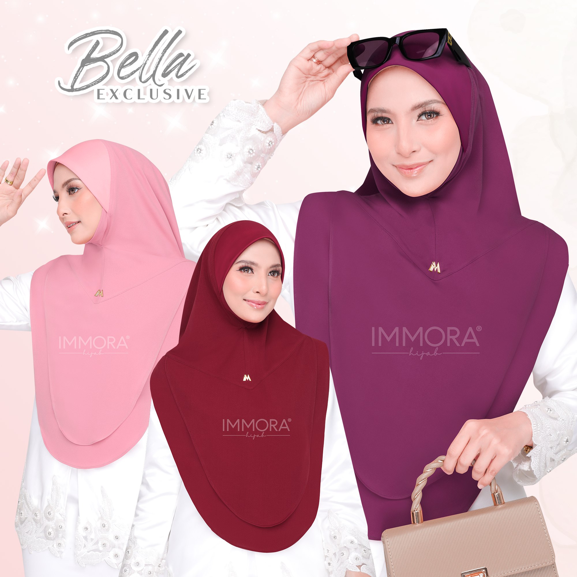 Menggunakan material satin matte textured, Immora Hijab sekali lagi mengeluarkan tudung yang boleh dipakai sepantas kilat. Material ini adalah shining di bahagian luar dan matte di bahagian dalam. Ratu exclusive didatangkan dengan 2 pilihan design iaitu awning shawl dan awning scuba. 1 tudung boleh digayakan dengan pelbgai style ini didatangkan dengan 22 pilihan warna yang menarik.