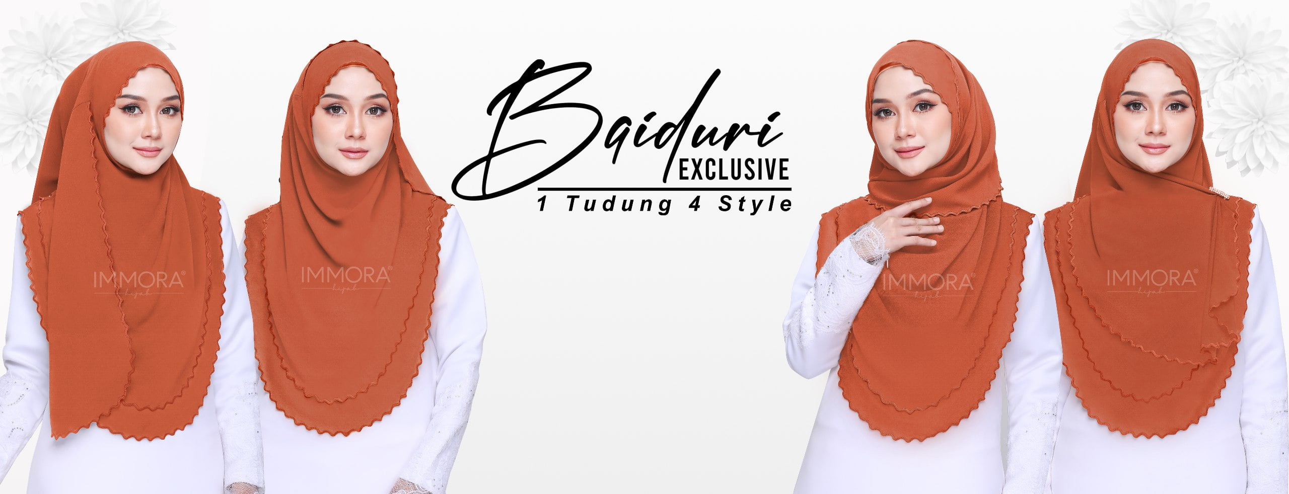 Baiduri Exclusive ini boleh digayakan dengan 4 style yang berbeza. Walaupun baiduri merupakan tudung sarung tapi effect shawl masih kelihatan sangat sesuai untuk digayakan semua peringkat umur. Jahitan sulaman sekeliling tudung memberikan effect yang lebih exclsuive dan trending untuk si pemakai.