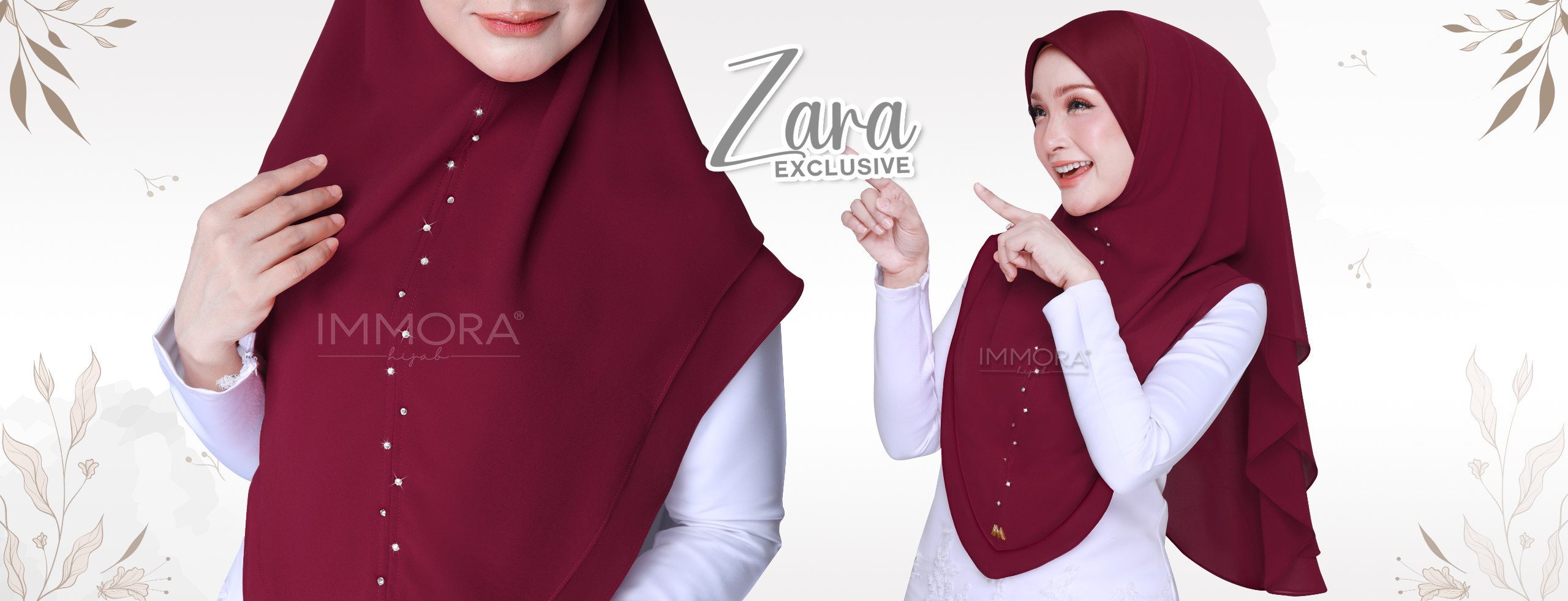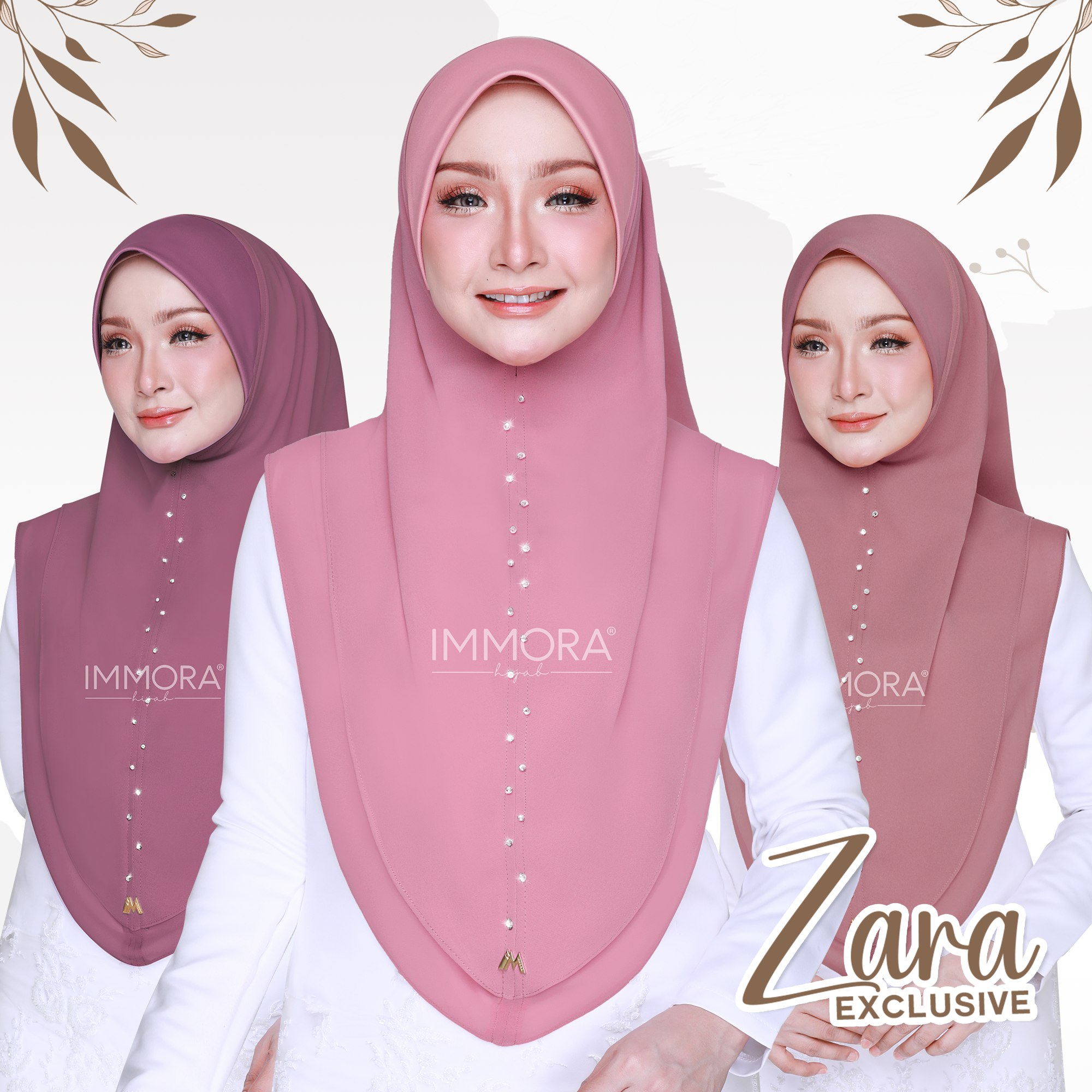 Didatangkan dengan 24 warna yang menarik, design Zara Exclusive dihiasi dengan susunan manik gred swarovski di bahagian hadapan membuatkan si pemakai kelihatan menawan. Menggunakan material premium chiffon membuatkan tudung ini teletak kemas dan flowee. Awning menggunakan material scuba membolehkan si pemakai untuk adjust mengukit keselesaan.