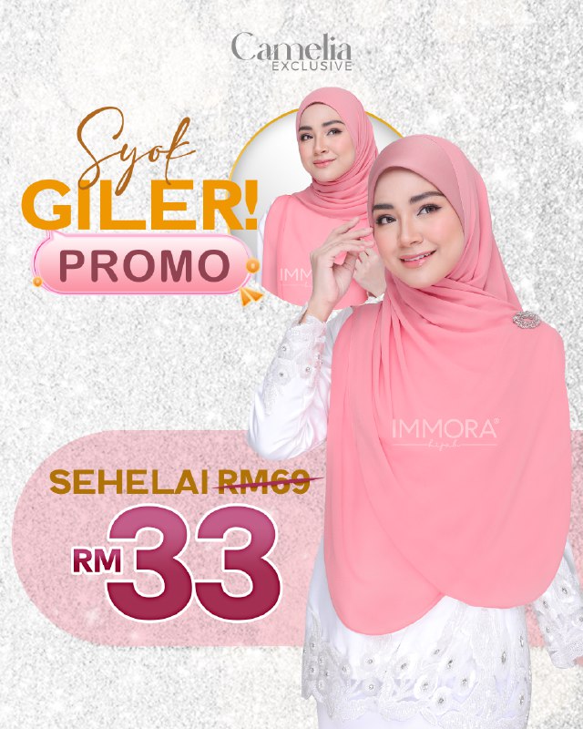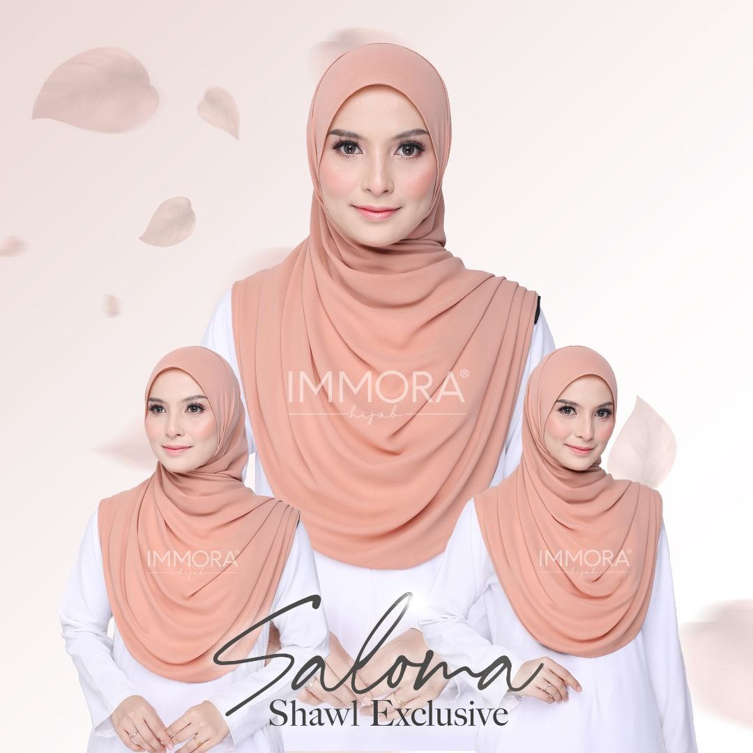 Atas permintaan peminat setia, Immora Hijab telah mengeluarkan Saloma Shawl buat kali pertama. Menggunakan material high quality chiffon korea silk, Saloma Shawl didatangkan dengan 22 warna yang up to date untuk pilihan pelanggan. Shawl 2 meter sesuai digayakan dengan pelbagai style untuk semua lapisan umur.