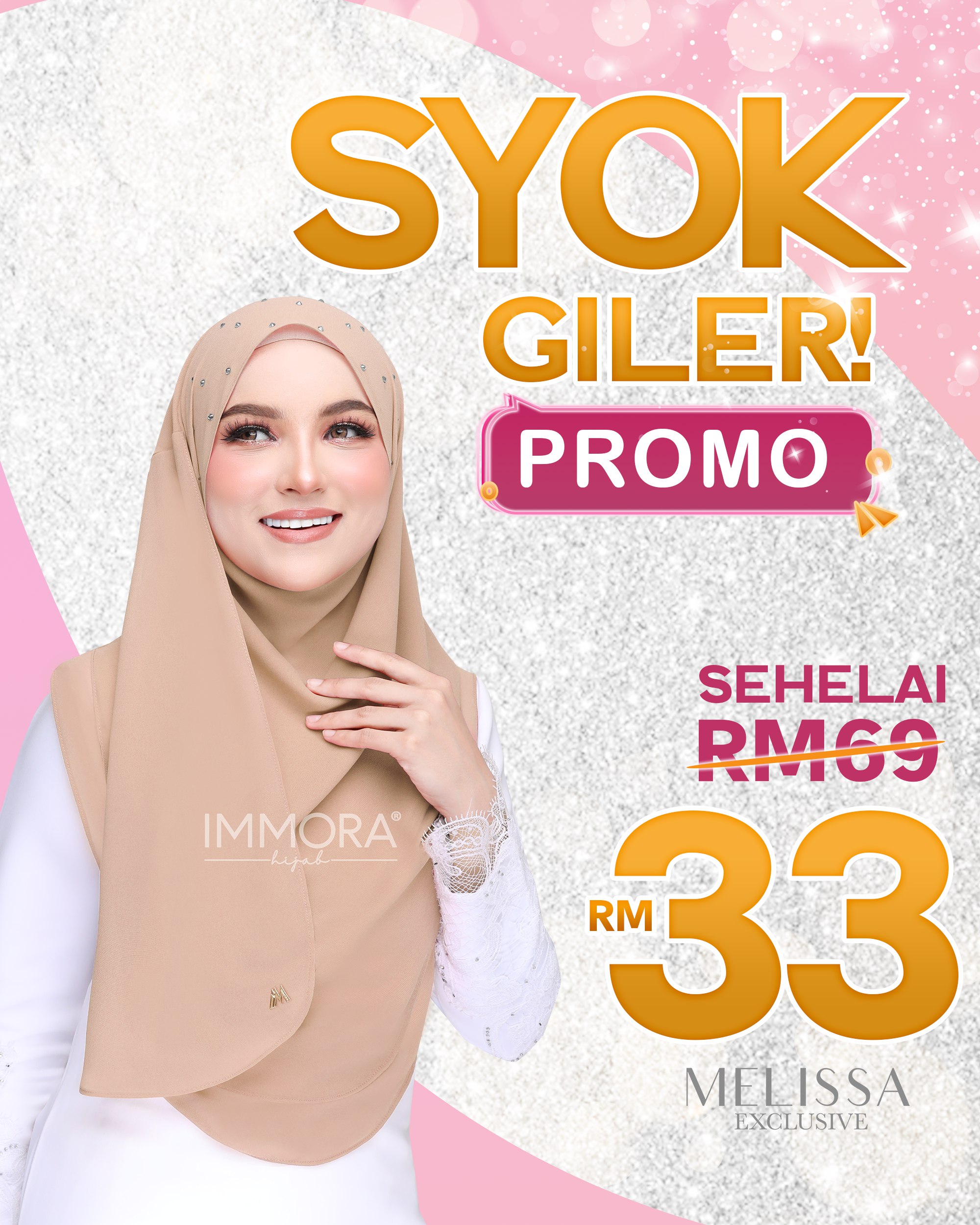 Didatangkan dengan 26 warna yang menarik, Melissa Exclusive dihiasi dengan hiasan Manik Gred Swarozski berwarna cristal gray. Tudung ini boleh dibuat dengan pelbagai gaya untuk kelihatan lebih cantik dan elegent. Material yang digunakan adalah Heavy Chiffon.